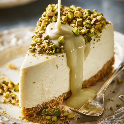 Rich and creamy pistachio cheesecake topped with chopped pistachios and silky pistachio cream, perfect for nut lovers and dessert enthusiasts.